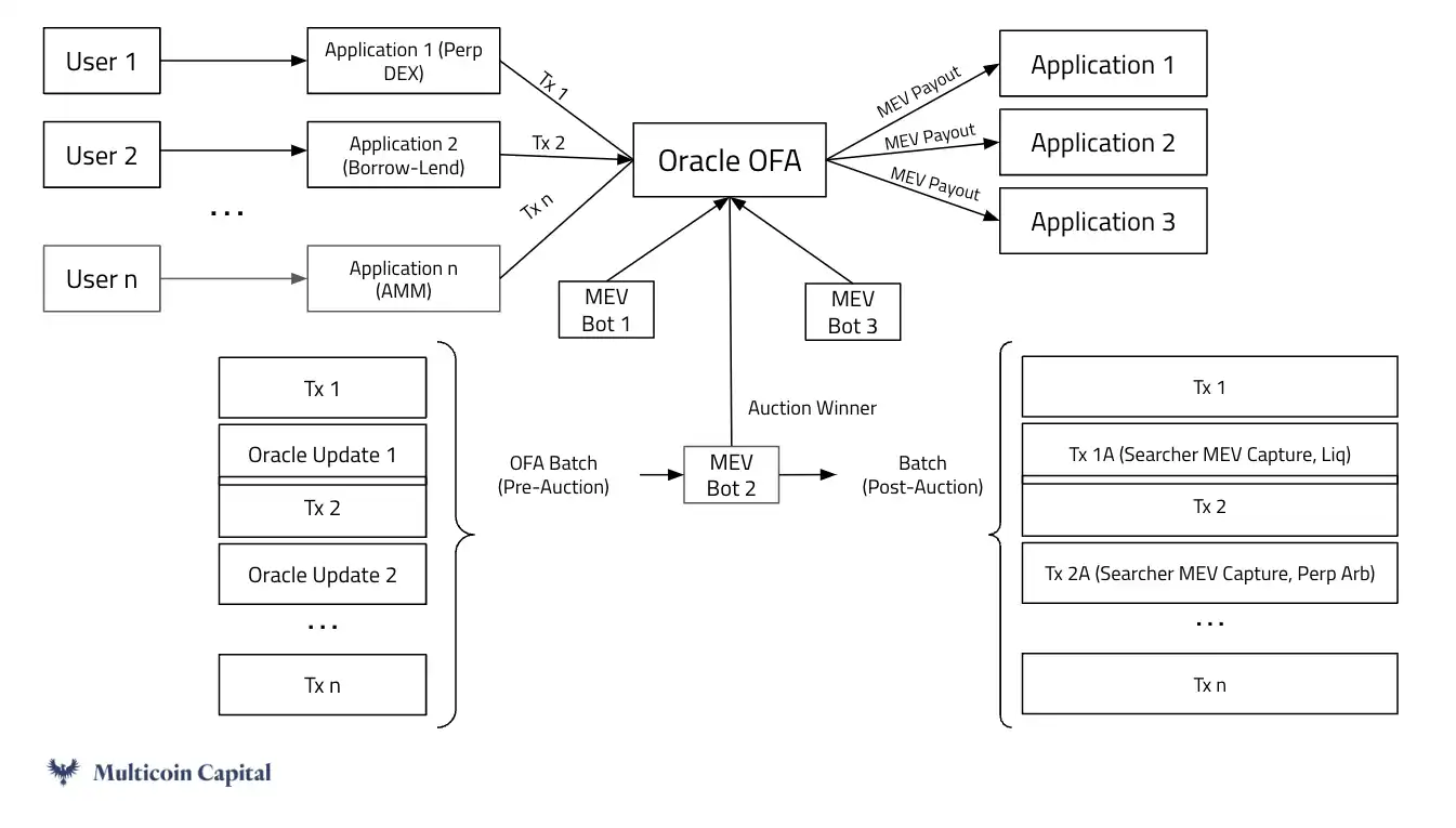 我们将 OEV 归类为后者,其中预言机更新触发价值捕获的机会。如今,生成 OEV 的活动给验证者和质押者带来了不成比例的好处,但牺牲了他们的用户(即流动性提供者)的利益。如果协议和应用程序能够捕获更多的 OEV,它们就可以重新分配这些利润,以激励和奖励用户忠诚度。最终,使 OEV 与用户保持一致的能力使用户协议更具竞争力。MEV 捕获的应用设计很困难。所有应用程序都希望最大限度地减少用户的 MEV,并将剩余的价值有效地重新分配给用户,或者自行内部化。如今,许多开发人员认为实现这一目标的唯一方法是将他们的协议部署为独立的应用程序链,目的是通过 MEV 为其原生代币积累价值,但这会带来巨大的技术、操作和互操作性复杂性。内部化 MEV 的首要正确解决方案是进行订单流拍卖 (OFA)。OFA 促进了一个市场,其中供应方由应用程序聚合的一批易于 MEV 的交易组成,而需求方由 MEV 机器人或做市商组成,它们寻求以有利于他们的方式插入或重新排序这些交易。拍卖的收益直接进入应用程序,并代表应用程序可以自己捕获的净 MEV 份额。