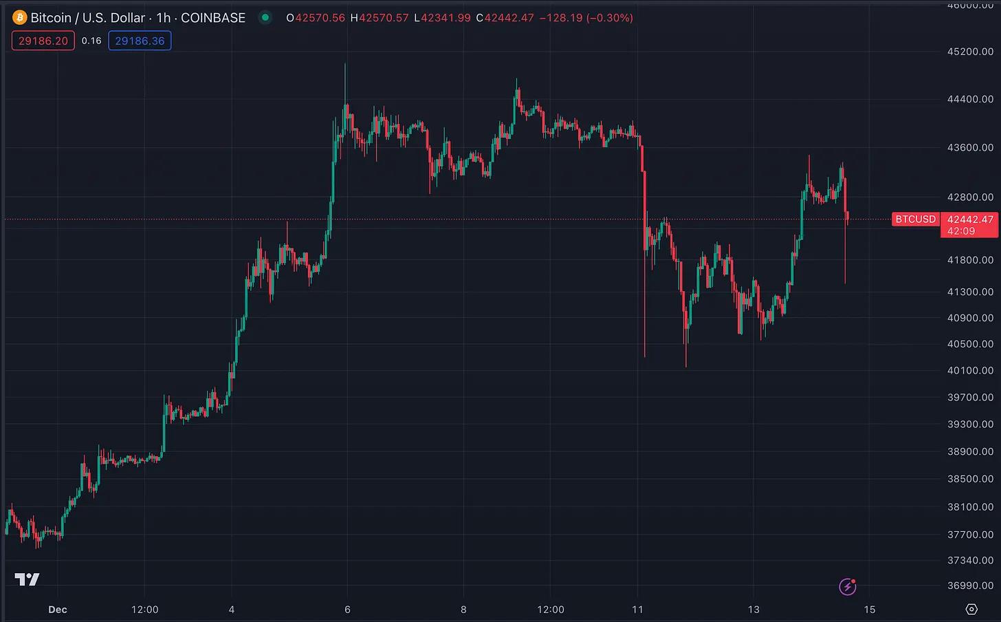 BTC 于 12 月 9 日达到了新的年度高点$44700,但自 10 月上涨趋势开始以来首次出现了显著下跌:跌至$40600,然后反弹至$42300,再次下跌至$40700。此时,市场再次出现恐慌。