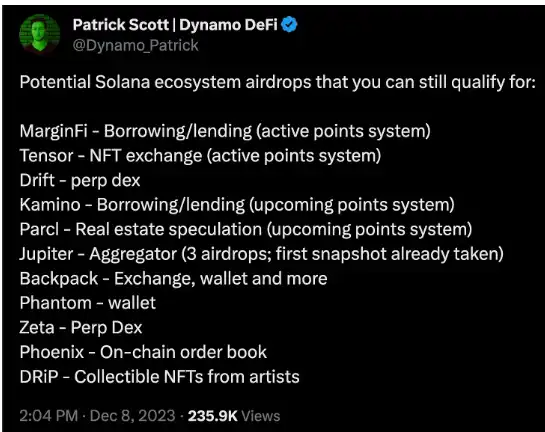 $JTO 空投对得到它的人来说绝对是巨大的收益,对大多数人来说至少是五位数,有时甚至是六位数的收益。人们意识到这一点后,开始争相进入 Solana 进行空投交互。对于那些不到六位数投资组合的人来说,空投绝对是很好的收益,因为一次好的空投可能与净资产相比非常可观。以下是我收藏的有关 Solana 空投的有趣推文:Solana 上可能存在空投的生态系统。