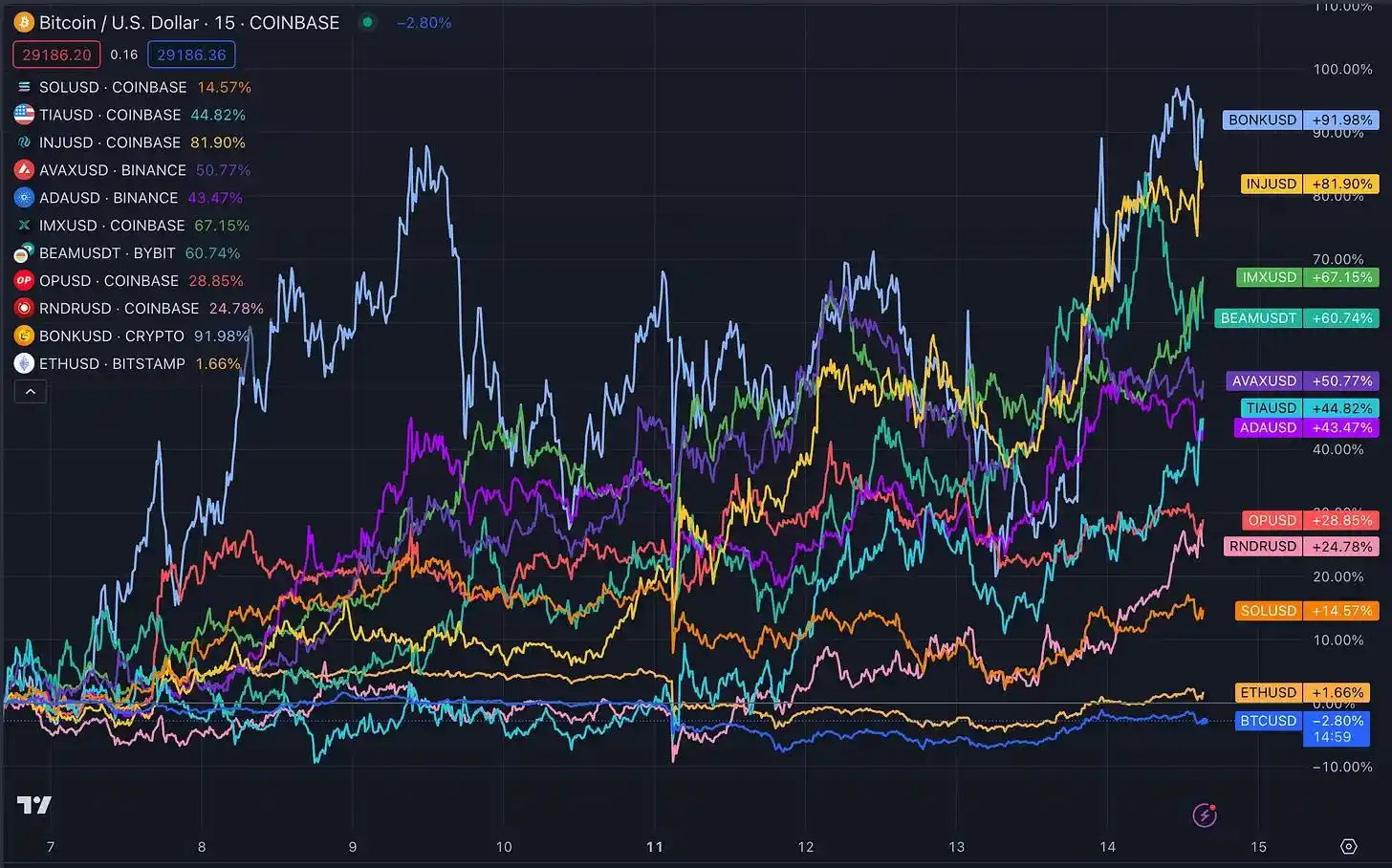 我最喜欢的 AI 币是 $RNDR(本周 +30%),它的上涨就类似于$INJ 的上涨。RNDR 和 INJ 相对于 BTC 的涨幅表现强劲,这就是为什么我预计 $RNDR 在整个周期中保持顶级的表现。