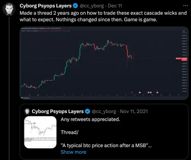 BTC 占比目前略高于 53%,自 12 月 5 日的 55% 下降。ETH 现在价格是$2280,本周略微跑输 BTC。如果你想更好地了解$BTC 跌后的价格行为,有两个资源可以参考。第一个是cyborg 的这个帖子。