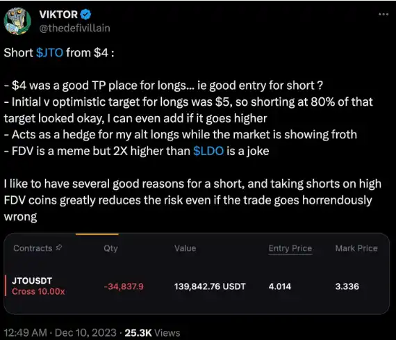 $JTO 本周推出,并向 $jitoSOL 持有者空投。我原本认为 $1 是卖出 $JTO 的好价格,因为 $1 意味着 10 亿美元的 FDV。惊讶的是,它在上市后很快就达到了 2 美元,然后在接下来的几天里甚至还有所上涨,达到了 4.4 美元的高点。我在 4 美元左右做空了$JTO,并在 Twitter 上记录了这一过程: