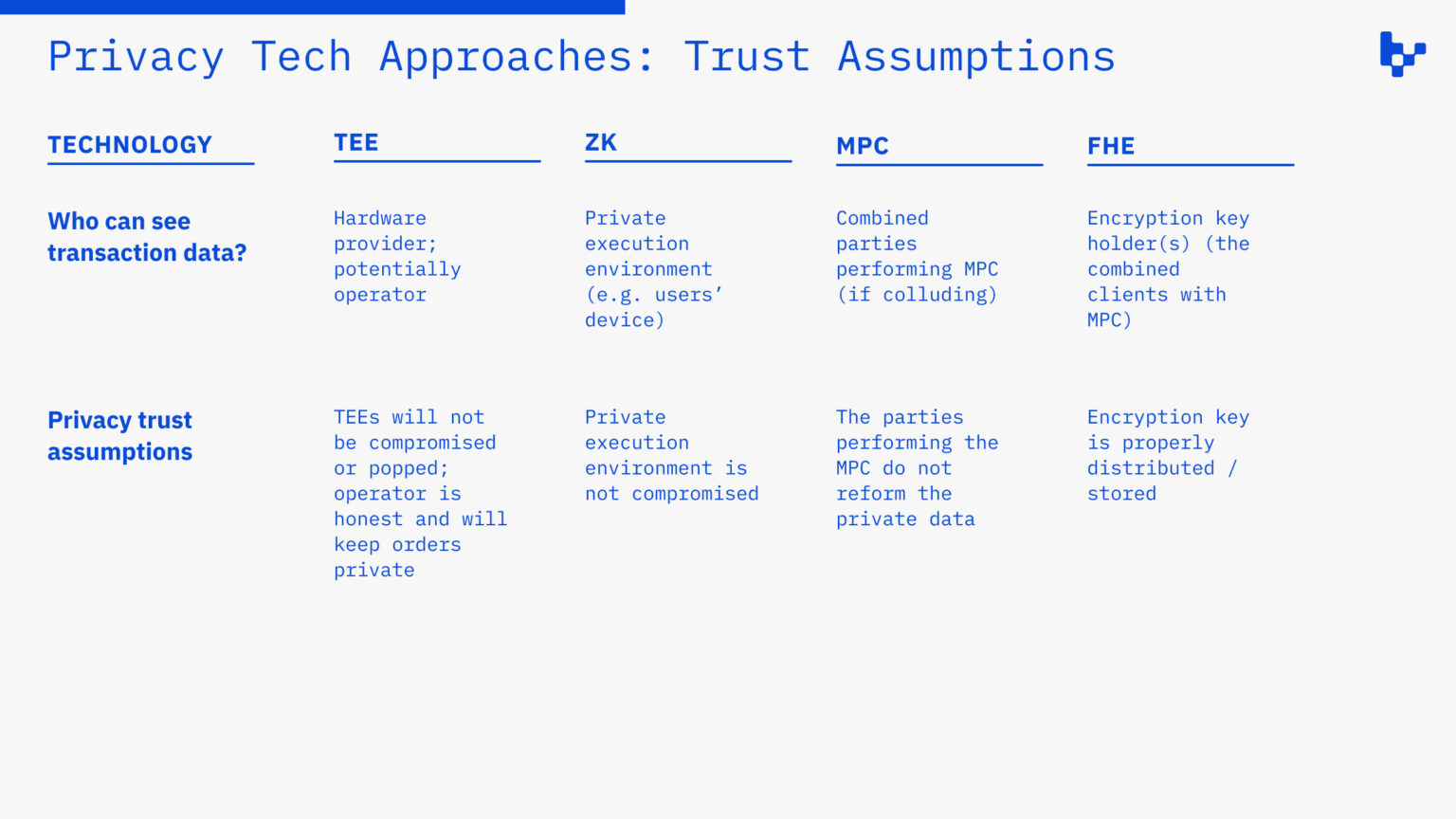 请注意,许多这些技术可以组合使用,它们的交叉点通常是最有趣的方法之一。例如,零知识证明可以用于去除基于 TEEs 的暗订单簿的操作者功能,而 MPC 通常用于在 FHE 中分发加密密钥。这些分类的目的是提炼每种独立方法的最高级技术考虑因素。最后,这个领域在潜在的非法活动方面存在明显的监管影响;基础设施构建者务必注意合规性。