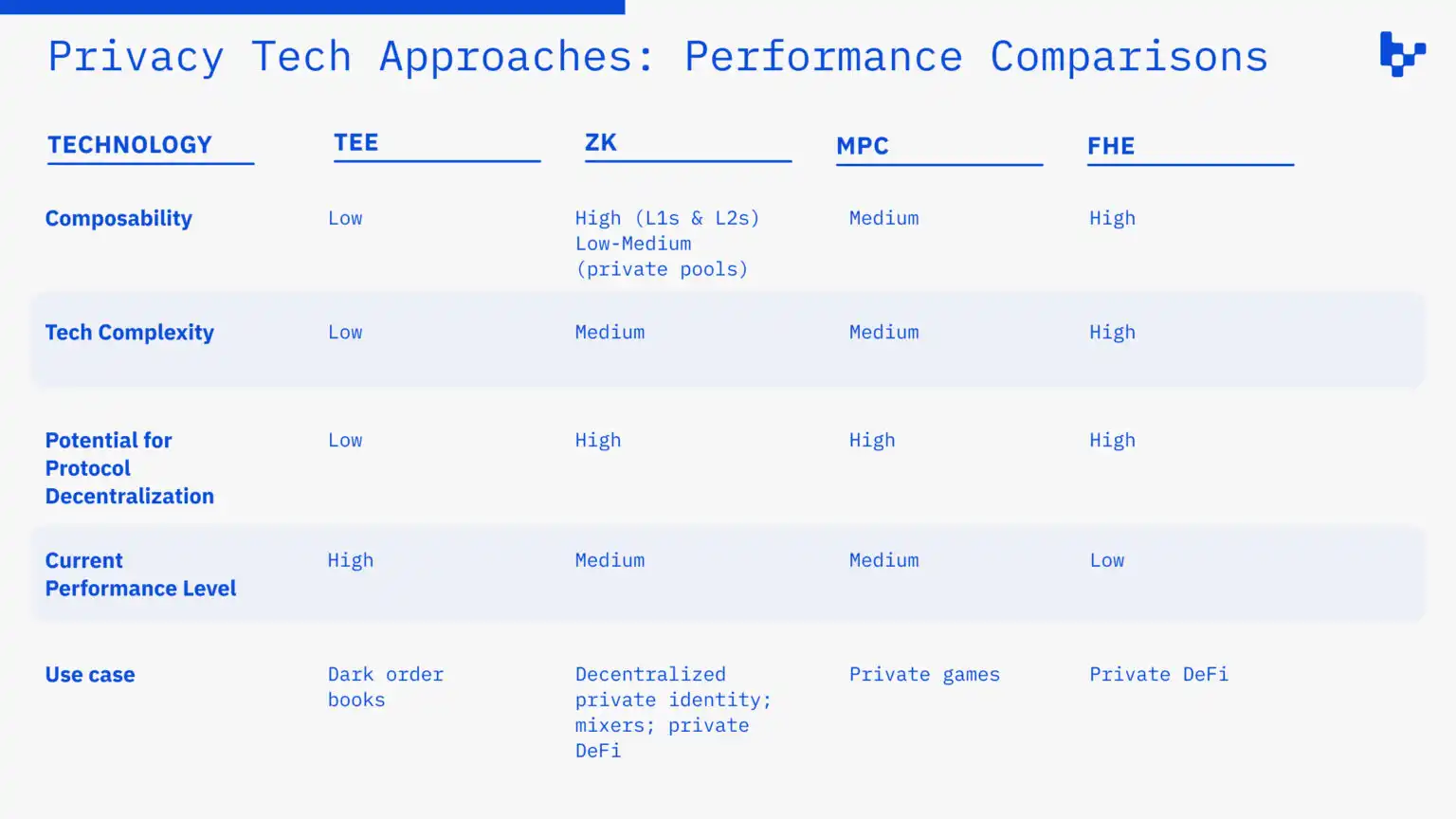 整个领域仍处于极为早期的阶段,因此以下比较仅仅是对未来几年内每种技术发展所需的投影。这些方法也并非等同或可互换的;用一把宽泛的刷子概括,它们大致可以分为专业硬件(TEEs)和密码学(ZK、MPC、FHE)。此外,它们中的许多方法在实际中有效地重叠。例如,FHE 必须与 ZK 和/或 MPC 结合使用。总的来说,观察每种方法的发展轨迹可以为更广泛的隐私类别如何发展提供可行的见解。