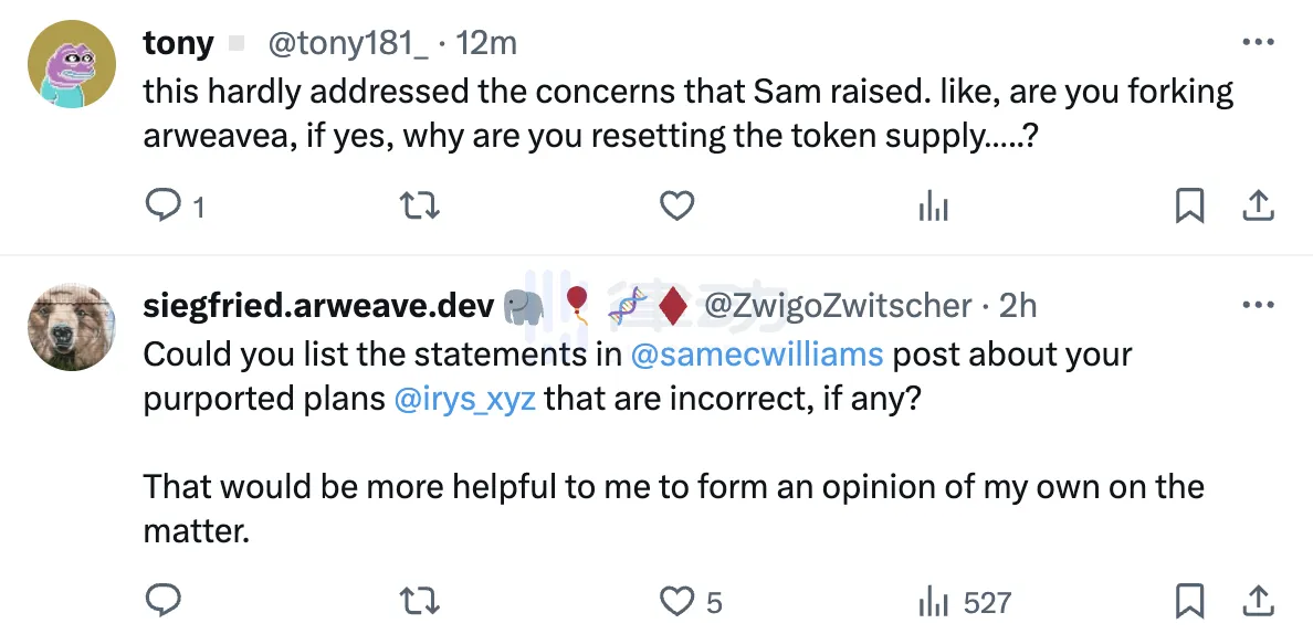 但总体而言,Irys 并未就 Sam 提出的分叉方式的问题做出正面回应,这也因此招来社区质疑,不少用户指出希望 Irys 正面回应分叉相关问题。