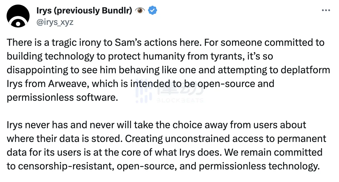 Irys 回应:Arweave 创始人的行为「令人失望」,是一个「悲剧性的讽刺」