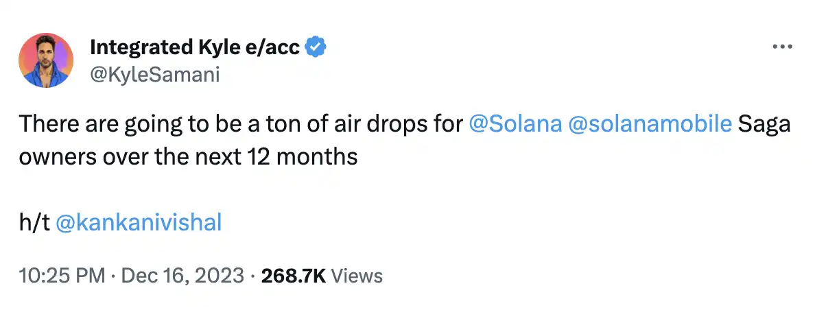 12 月 17 日,Multicoin Capital 的联合创始人 Kyle Samani 在社交平台上表示,预计未来 12 个月内 Solana 手机 Saga 所有者将获得大量空投活动。昨日,Solana 生态 Meme 项目 Samoyedcoin 宣布将为 Saga 手机持有者发放 SAMO 代币空投,具体空投详情尚未公布。