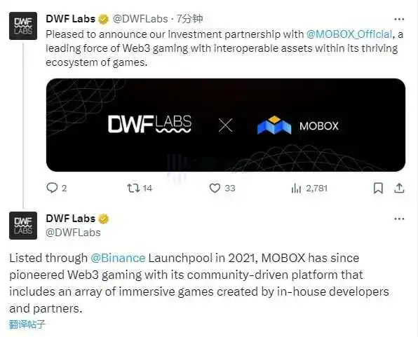 12 月 19 日,DWF Labs 已投资游戏元宇宙平台 MOBOX,将促进 MOBOX 在各个交易所提供更多流动性、增强投资组合之间的协同效应、扩大区域主要合作伙伴关系以及公关和线下活动合作等方面的增长。