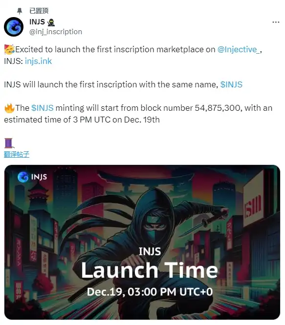 12 月 19 日,Injective 首个铭文项目 INJS 在其社交平台表示,INJS 将从区块号 54,875,300 开始铭刻(预计为北京时间今日 23 时)。