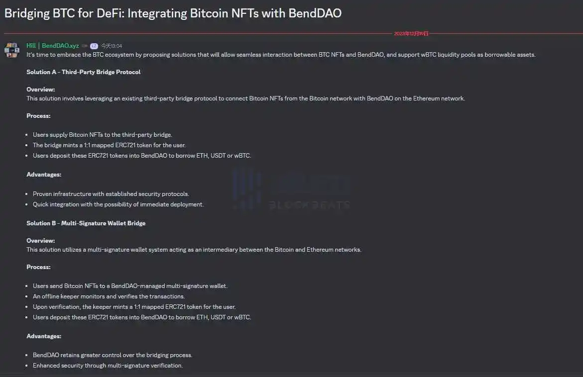 12 月 19 日,NFT 借贷平台 BendDAO 在其 Discord 社区发布公告称,团队拟提出解决方案来拥抱比特币 NFT 生态系统,该解决方案将允许 BTC NFT 和 BendDAO 之间的无缝交互,并支持 wBTC 流动性池作为可借贷资产。