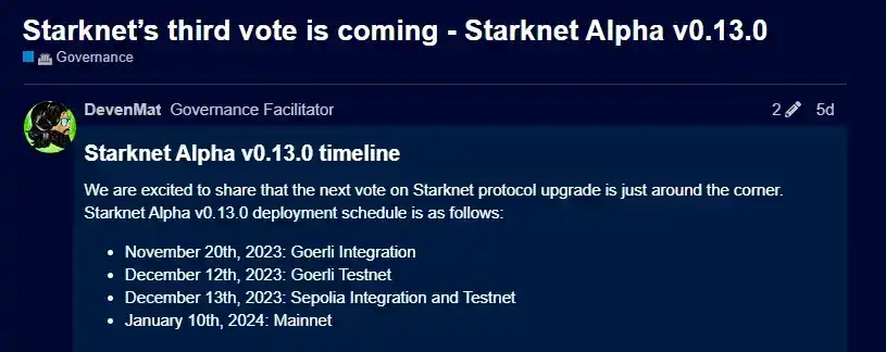 Starknet 在其社区分享 v0.13 主网时间表,按照计划,Starknet 主网 v0.13 更新将于 2024 年 1 月 10 日进行,届时 Starknet 将支持 STRK 代币支付 Gas。