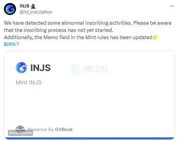 12 月 19 日,Injective 首个铭文项目 INJS 在其社交平台表示,已检测到一些异常的铭刻活动。请用户注意,铭刻过程尚未开始。此外,Mint 规则中的 Memo 字段已更新。用户可参考官方文档。 此前消息,INJS 项目方宣布将从区块号 54,875,300 开始铭刻。