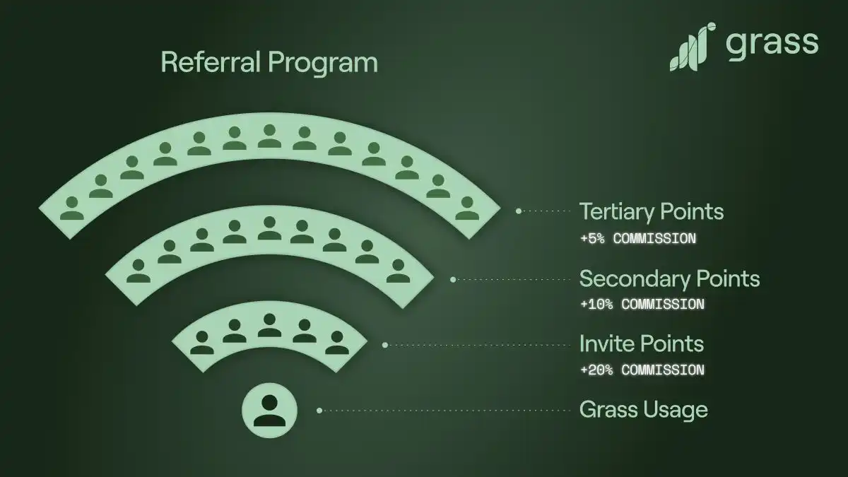 除了通过 Wifi 挂机获得积分外,Grass 还设置了激励推荐系统。推荐系统包括三级,分别可以获得所推荐用户产生的 20%、10% 和 5% 的积分。