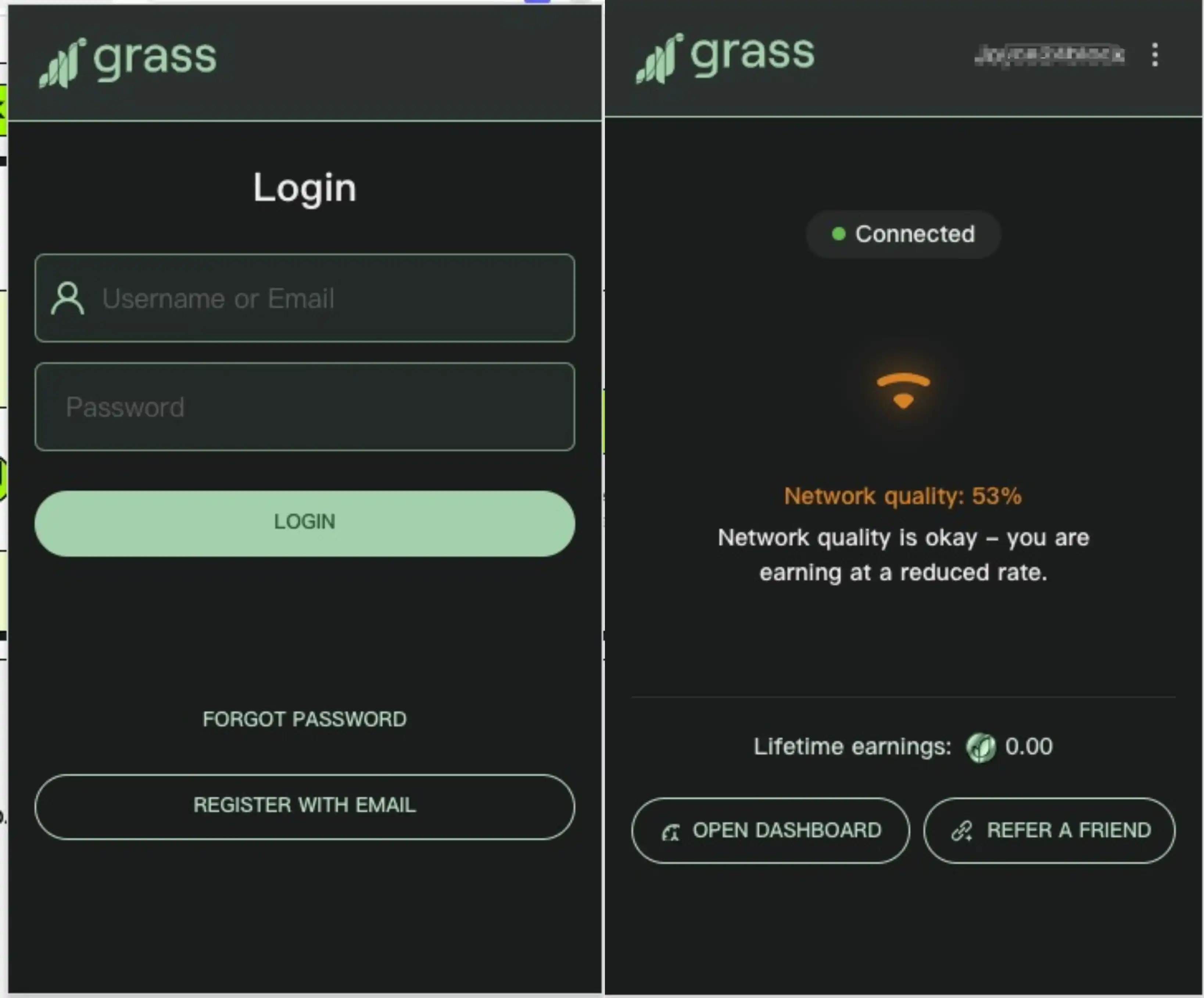 在插件界面登录之前注册的邮箱账号,显示「Connected」时表示连接成功,保持 wifi 连接状态,就可以持续产生 Grass 积分。需要注意的是,需要关闭 VPN 才能产生积分,用户的积分机制并不固定,受 IP 所处的地理位置和网络环境影响。