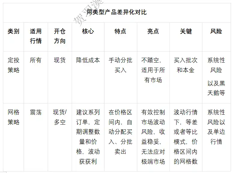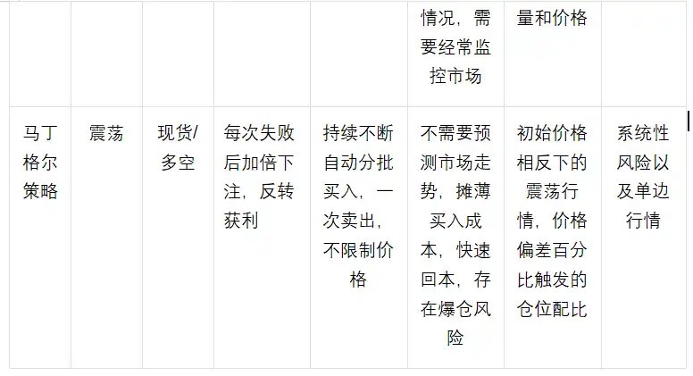 同样是降低成本的策略,相比于手动定投的被动式投资,马丁格尔策略更加灵活且成本控制更有弹性,相比于网格交易,马丁格尔策略不需要预测市场走势,相对可以快速回本,但存在爆仓风险。网格策略则可以有效控制市场风险,且收益稳妥,但需要经常监控市场,无法应对极端市场情况。