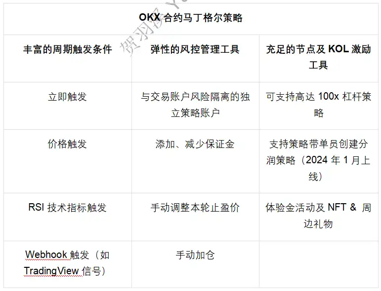 作为全球领先的加密资产交易所和 Web3 科技公司,OKX 为满足全球不断增长的加密用户多元化需求,当前已经上线包括合约马丁格尔在内的 14 种高级策略,在行业遥遥领先。并持续创新升级更加高级、差异化的投资策略和工具,第一时间接收并满足用户需求,不遗余力地构建未来金融工具。