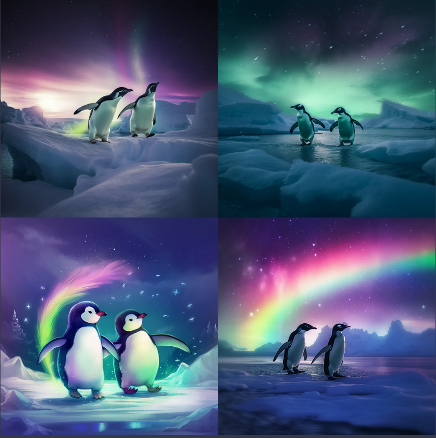 Prompt: 提示:Two penguins, cute, walking in the ice and snow, accompanied by the aurora behind them(两只企鹅,可爱,行走在冰天雪地里,身后有极光相伴)