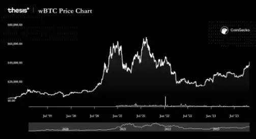 wBTC 是通过托管方与授权的实体和商家合作创建的,比特币存入后以 1 比 1 的比例发行 wBTCToken。用户可以将 wBTC 转回比特币,商家销毁相应的 wBTCToken,托管方将等值的比特币返还给用户。系统通过第三方审计和链上数据分析来确保真实性。截至 2023 年 12 月 4 日,wBTC 的市值约为 67 亿美元,24 小时交易量接近 2.39 亿美元。在 2023 年 10 月 24 日和 11 月 9 日,交易量曾有较大增长。