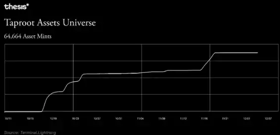 目前比特币上的 Taproot 资产的交易和价值数据很少。尽管网络上已经有将近 65,000 个独特资产铸造,但该协议目前仍处于首次实施阶段,因此这些主要还是实验性质的。