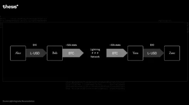 请注意,中介交易并不直接传输稳定币本身——无需选择,只要有可用的 BTC 流动性,交易就可以进行路由。最终以 Taproot 资产结算的发票可以用 BTC 或任何其他资产支付,任何拥有 Taproot 资产余额的人都可以支付任何闪电发票。