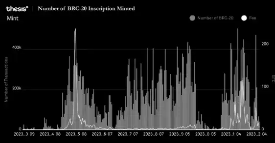 尽管 BRC-20Token 的价值波动不同,但整体生态系统显示稳健。活动在 2023 年 5 月至 7 月间相对稳定,之后在 2023 年 9 月末至 10 月底有所反弹。特别值得注意的是,2023 年 11 月,BRC-20Token 创下了铸造超过 492000 个 Token 的历史新高。