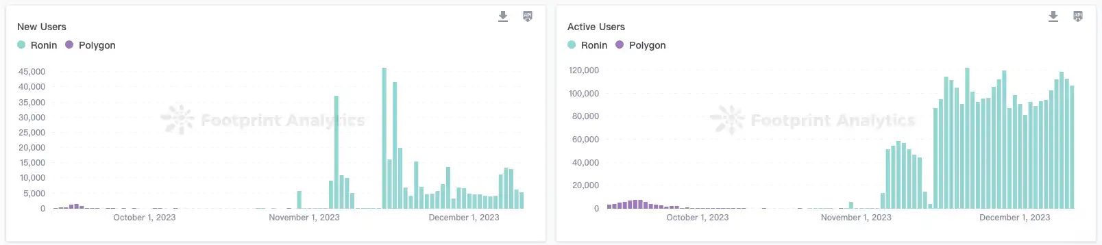 据 Nansen 发布的数据显示,在 11 月份,Ronin 活跃地址数超 46 万,较前一个月环比增幅 368%,是所有以太坊侧链中增幅最大的。经历一轮牛熊后,浪人 Ronin 还在这里。