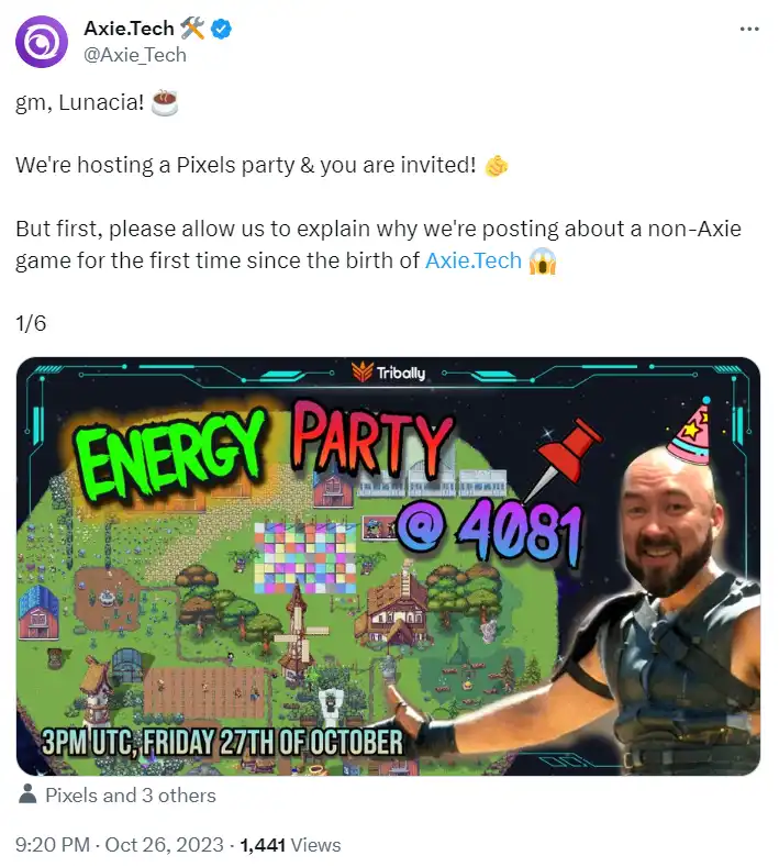 2021 年创立的 Web3 游戏社交平台 Tribally 旗下社区工具网站 Axie.tech 是 Axie Infinity 的官方社区合作伙伴。Tribally 在今年 10 月 23 日宣布了与 Pixels 的合作关系,之后,Axie.Tech 在推特上发起了「Pixels party」,可以理解为 Axie Infinity 社区玩家在 Pixels 游戏里的「团建」,这是第一次非 Axie 系列游戏出现在 Axie.Tech 的推文中。