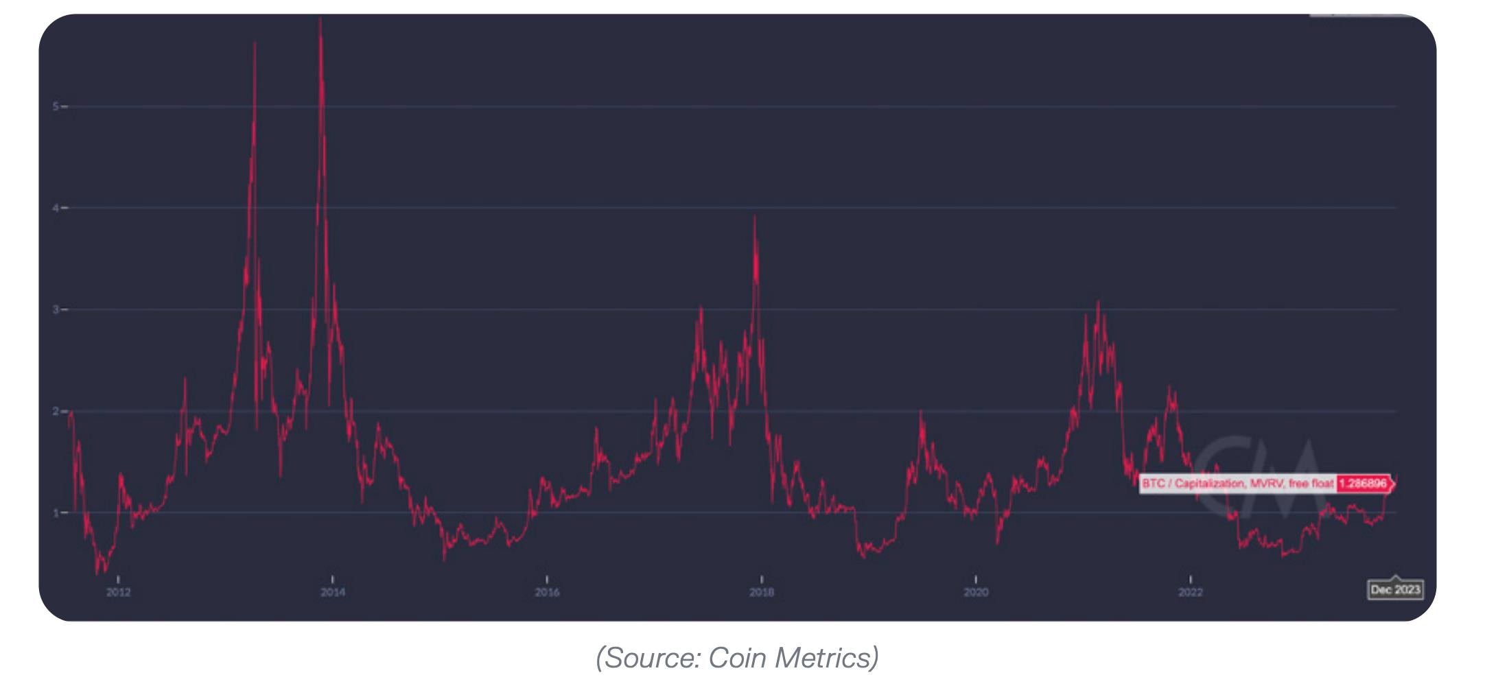 也许我们不再处于深度价值领域,但鉴于目前支持我们的一些机构性顺风事件(ETF 批准、FASB 会计变更、新的主权买家等,见第 4.1 章),投资者买入 MVRV 比率为 1.3 的比特币显然不再是一次盲目的信仰之跃。