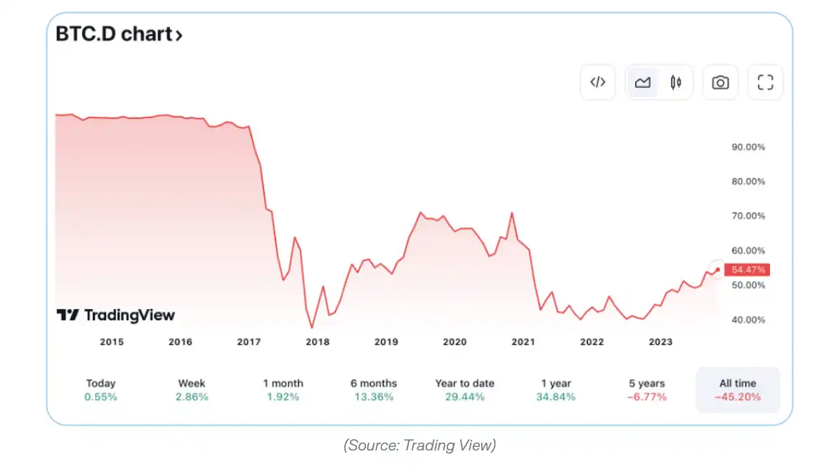 有了这样的势头,我的赌注是,在 ETF 驱动的集会中(引领上升)或严重的宏观压力(在下降中整合)中,比特币的主导地位将重新达到 60%。