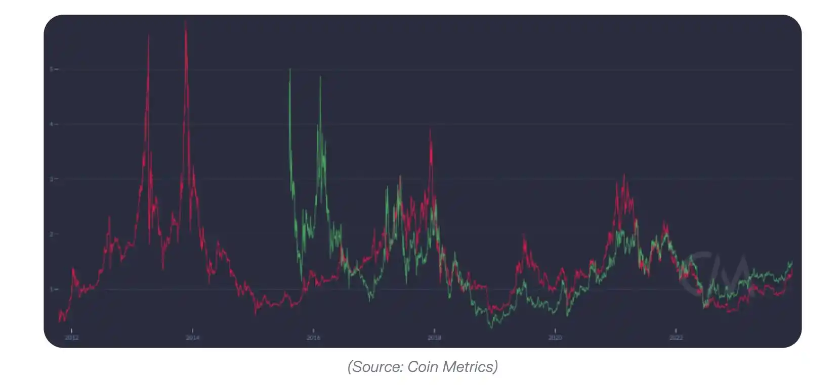 在以上计算理论中,如果二者比值在 1 以下是黄金地带。3 以上的比值总是标志着一个周期的顶峰。