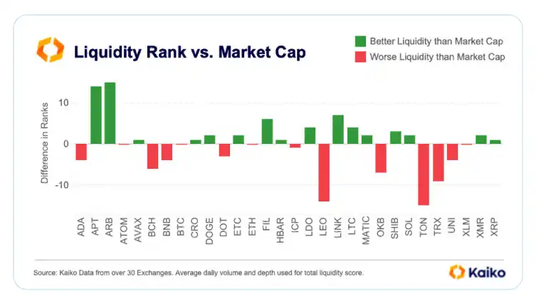 一个简单的在家实施的指数投资策略可能是监控 Kaiko 的流动性列表,并按季度进行重新平衡。如果你购买流动性排名高于市值排名的绿色资产,卖出市值排名高于流动性排名的红色资产,那么你基本上就复制了我今年迄今为止的大型资产长/短名单(当然,这不是投资建议)。