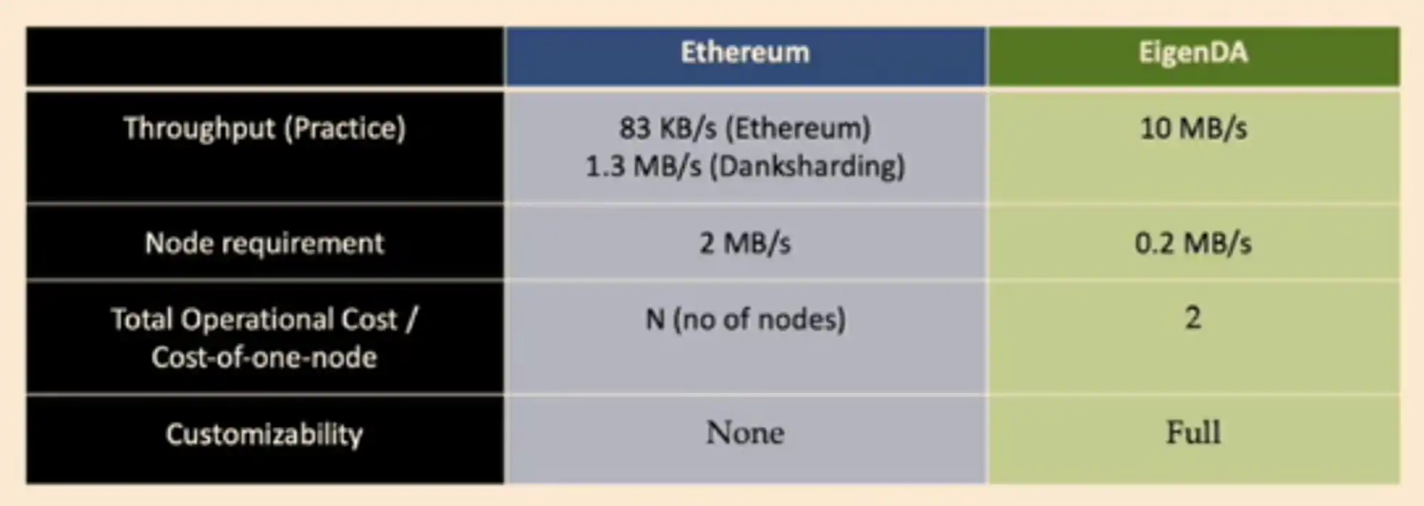 - 根据模块化概念,Rollup 将交易数据发布到只负责数据可用性的数据可用性层或许是更有效的办法(以太坊的理论性能可能略差,因为除了数据可用性之外,以太坊仍然保留 Layer 1 的执行,参见下面的 EigenDA 和以太坊的性能比较)。