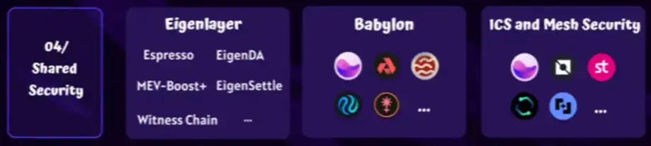 ·共享安全性:共享安全层必不可少,因为它减少了为新协议或模块层确保安全所需的时间和资源,使其具有可与以太坊等成熟平台相媲美的强大安全性。目前已有许多解决方案,如 Eigenlayer、Babylon、Cosmos 的 ICS 和 Mesh Security 等应用。