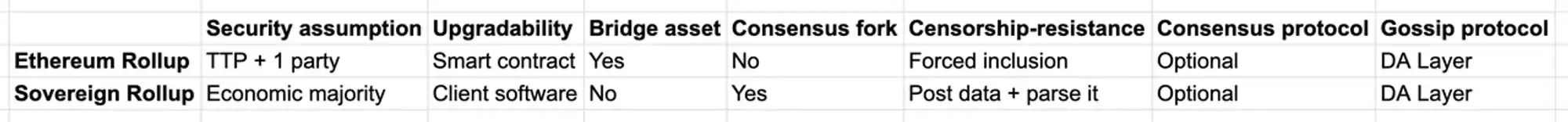 至于主权 Rollup,主要区别在于链状态由 Rollup 全节点结算,而不是 Layer 1 中的智能合约。更详细的比较可以参考 https://www.cryptofrens.info/p/settlement-layers-ethereum-rollups