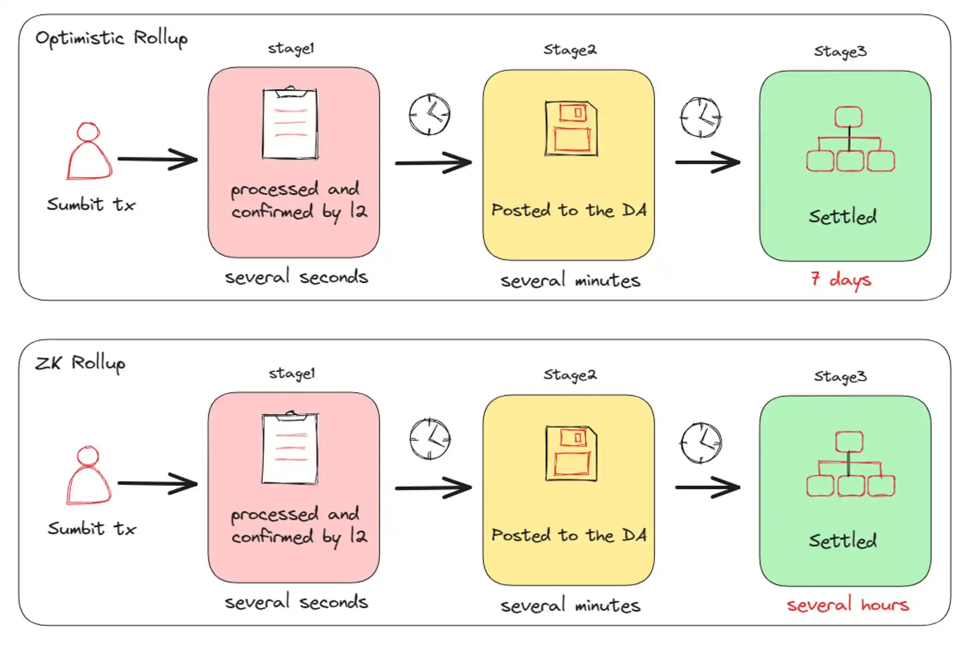 ·为节省成本,提交给数据可用性 / 结算层的 Rollup 交易数据会有时间延迟(如上所述,Optimistic Rollup 需要 1-3 分钟,而 zk Rollup 则需几个小时)。对于需要更快、更安全的最终结果的用户,这一点需要抽象出来。