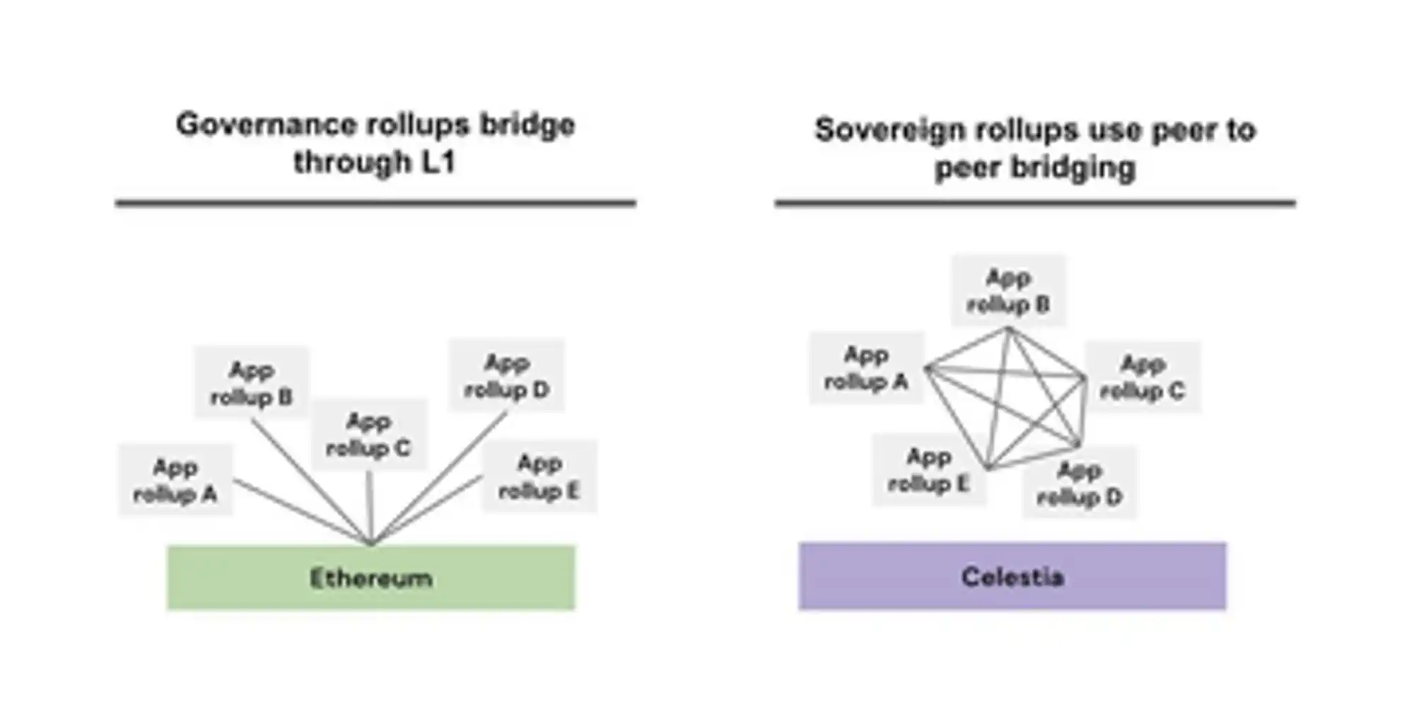 ·尽管生态中的 Rollup 层出不穷,但值得注意的是,目前大多数智能合约 Rollup 共享一个通用的结算层,即以太坊。这些 Rollup 之间的主要区别在于其执行层和排序层。为了实现互操作性,这些 Rollup 只需要相互验证共享结算层的最终状态。然而,对于主权 Rollup,情况则会稍微复杂一些。由于结算层不同,主权 Rollup 要实现互操作性有一定的挑战。解决这个问题的一种方法是建立点对点(P2P)结算机制,每条链直接嵌入另一条链的轻客户端,促进相互验证。另一种方法是,这些主权 Rollup 可以首先桥接到一个中心化结算中心,然后作为连接其他链的中转站。这种以中心为核心的方法简化了流程,并确保了不同 Rollup 之间的互联更为紧密。(类似于 Cosmos 互操作的状态)
