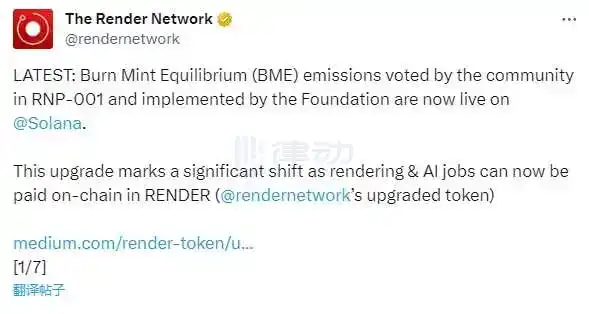 12 月 21 日,据官方消息,去中心化 3D 渲染解决方案提供商 Render Network 宣布其 BME(Burn Mint Equilibrium)释放计划已上线 Solana 网络,网络升级后的代币 RENDER(原 RNDR)也已上线 Solana,并可进行链上支付。Render Network 表示,BME 模型旨在实现供需平衡,帮助创作者预测他们的渲染和 AI 作业,同时使节点运营商能够高效地提供计算服务。