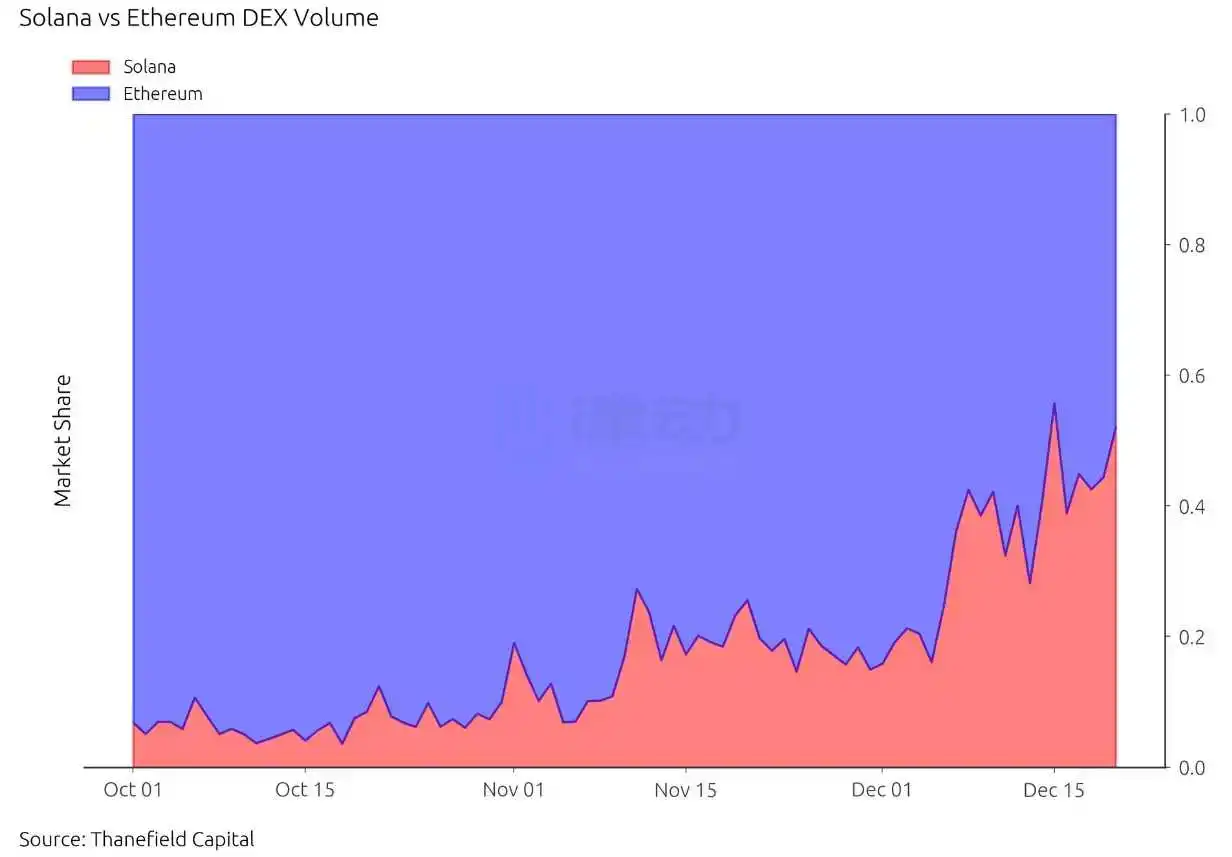 12 月 21 日,链上数据显示,Solana 生态 DEX 单日 交易量历史上第二次超过以太坊,日交易量超过 12 亿美元。分析师认为,通过低成本的费用和更快的交易提供更好的用户体验,再加上生态系统中最近的财富效应,Solana 获得市场份额的趋势可能会持续下去。