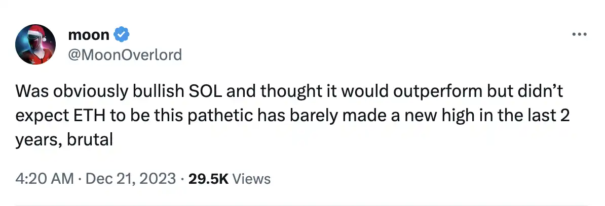 加密货币交易员 @MoonOverlord 在 X 上写道,「显然看涨 SOL,认为它会跑赢大盘,但没想到 ETH 这么可怜,在过去两年里几乎没有创出新高,残酷。」据 CoinGecko 数据,SOL 近一年涨幅达 587.4%,而 ETH 近一年涨幅仅为 81.7%。