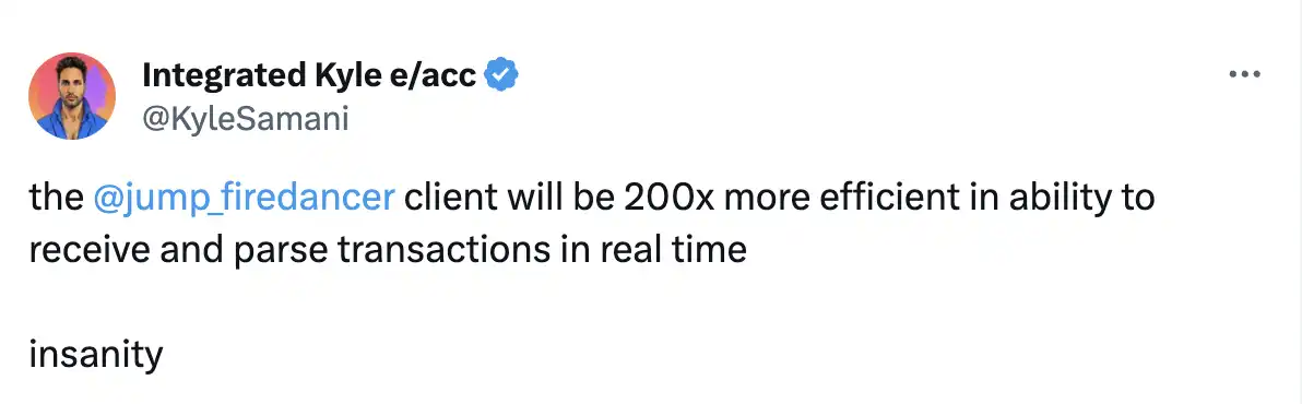今日,Multicoin Capital 的联合创始人 Kyle Samani 在 X 上提到 Firedancer 实时接收和解析交易的效率将提高 200 倍,进一步为市场吃了一颗定心丸。