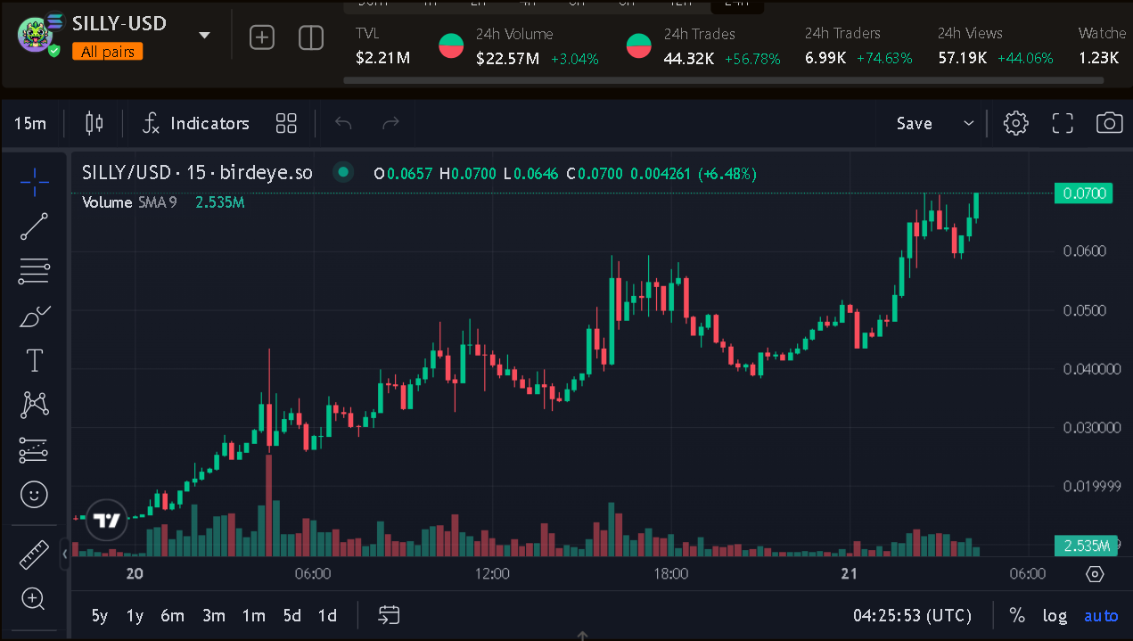 自 12 月 16 日推出后,SILLY 在两天内市值和交易量出现令人印象深刻的飙升,在 Swap |Jupiter 去中心化交易所的交易量达到 3000 万美元,市值从零升至近 1000 万美元,经历了惊人的 900% 的增值。据birdeye数据显示,截至撰稿时,SILLY 价格突破 0.07 美元。