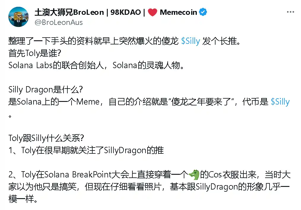 「所以这次的 Silly 我就打算长持了,背景这么正统又有大佬加持,万一再来个 Bonk 呢?」@BroLeonAus 补充道。
