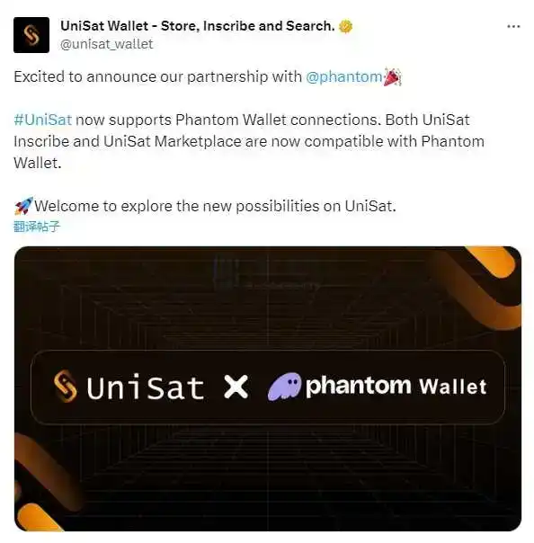 据官方消息,比特币铭文市场及钱包供应商 Unisat 宣布已支持 Phantom 钱包接入。UniSat Inscribe 和 UniSat Marketplace 现在均与 Phantom 钱包兼容。此前消息,加密货币钱包 Phantom 表示将集成比特币网络。