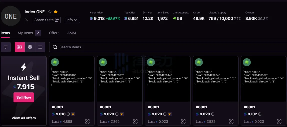 据行情数据,Index ONE NFT 地板价突破 9 SOL,现报价 9.020 SOL,24 小时涨幅达 68.57%。