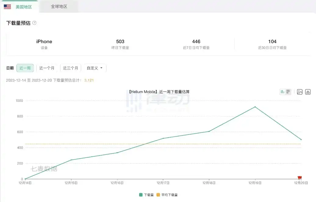 据第三方 appstore 数据平台显示,昨日 Helium Mobile 在美区 App Store 的 iPhone 用户预估下载量为 508 次,相比 12 月 19 日略有减少;近 7 日日均下载量为 446 次,过去一周预估下载量总计 3121 次。