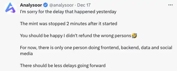 而就在社区开始期待 ZERO 的后续发展时,12 月 16 日,在 Analysoor 将进行第二次部署、也是协议的第一个 NFT 系列「ONE」时,如果说 ZERO 的铸造过程是「有惊无险」,在社区看来,ONE 系列的铸造则是「漏洞百出」。首先,其铸造时间又遇到了推迟,然后,ONE 在铸造了两分钟即被关闭,Analysoor 宣布将在次日重新铸造,所筹集的 513 SOL 也在之后被退还至用户。