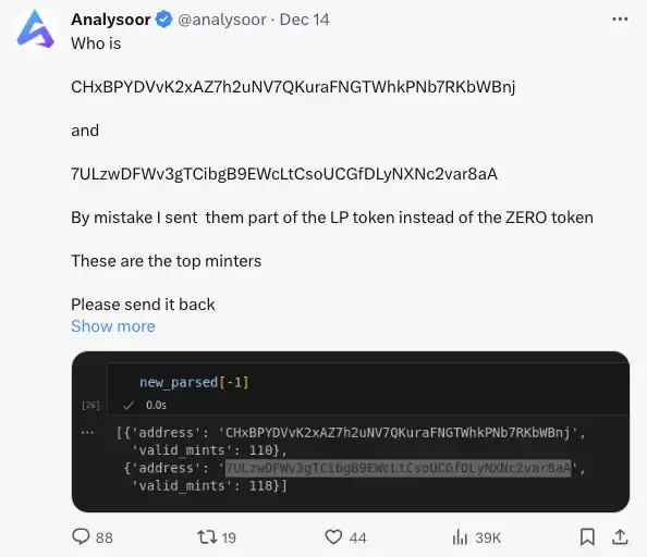 但是 ZERO 在铸造过程中遇到了一波三折的经历。先是推迟了原本计划的 12 月 14 日下午 3 点的铸造时间,再是在 mint 结束约三小时后,还有一些用户并没有收到应得的 ZERO 代币。而最意外的是,Analysoor 在社交媒体表示,原本计划作为 LP 池的资金被错误的发送到了 ZERO 持有者那里,并放出了持有者的钱包地址,呼吁他们退还 ZERO。此举让用户直接在评论区留言「drama」。