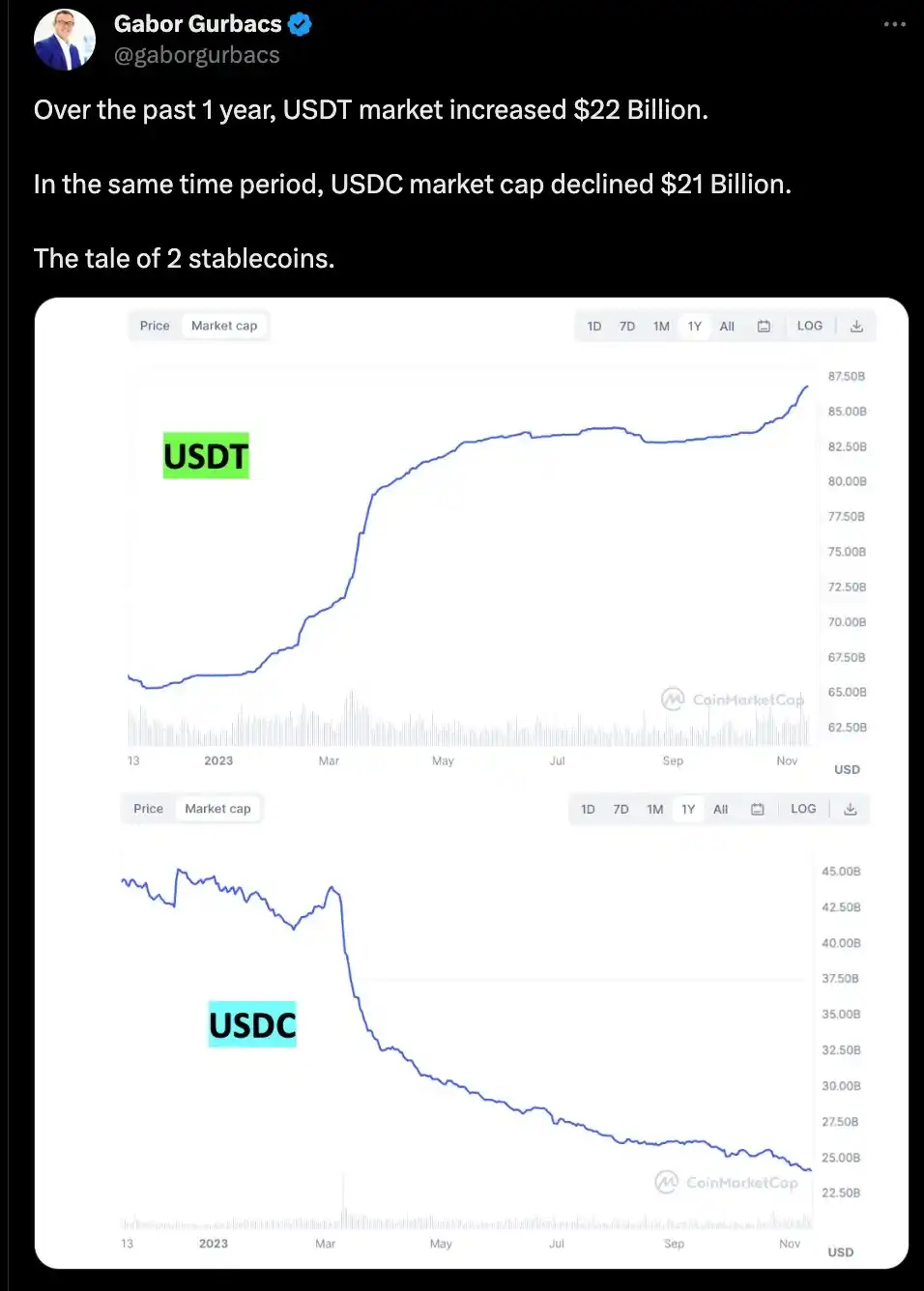 Tether 的主导地位找到了一个意想不到的盟友:托管 USDC(USDT 的主要竞争对手)账户的美国银行(硅谷银行等)的破产。