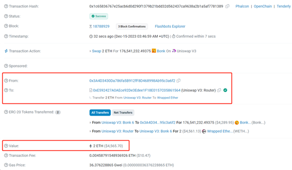 区块链上没有秘密,DeFi 的数据透明度也是无可争议的。以 Uniswap V3 上的某一笔交易为例,我们可以通过 Etherescan 网站轻松查看该交易详情(如图 1 所示)。例如,地址 0x3A4D...a6f2 在 Uniswap V3 上用 2 WETH 兑换了 17,654,123,249,375 Bonk,交易费用为 0.0046 Ether。这些交易中的发送者(From)、接收者(To)、交易金额(Value)以及手续费(Transaction Fee)等关键信息都是公开可查的。