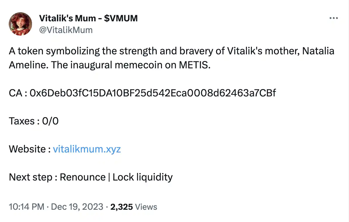 VMUM 是一个打着「Vitalik 母亲」名号的 meme 币,于 12 月 19 日部署,据 DEX SCREENER 数据,截至撰稿时,VMUM 目前价格为 0.00007512 美元,24 小时上涨 508%。